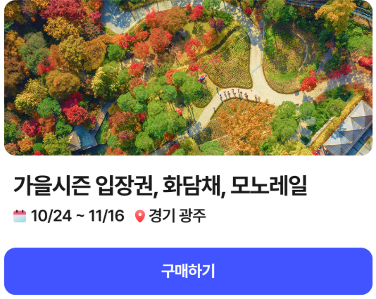 화담숲은 시즌별로 예약 오픈일이 공지되며, 특히 단풍 시즌(10월~11월)의 경우 조기 매진이 일반적입니다.